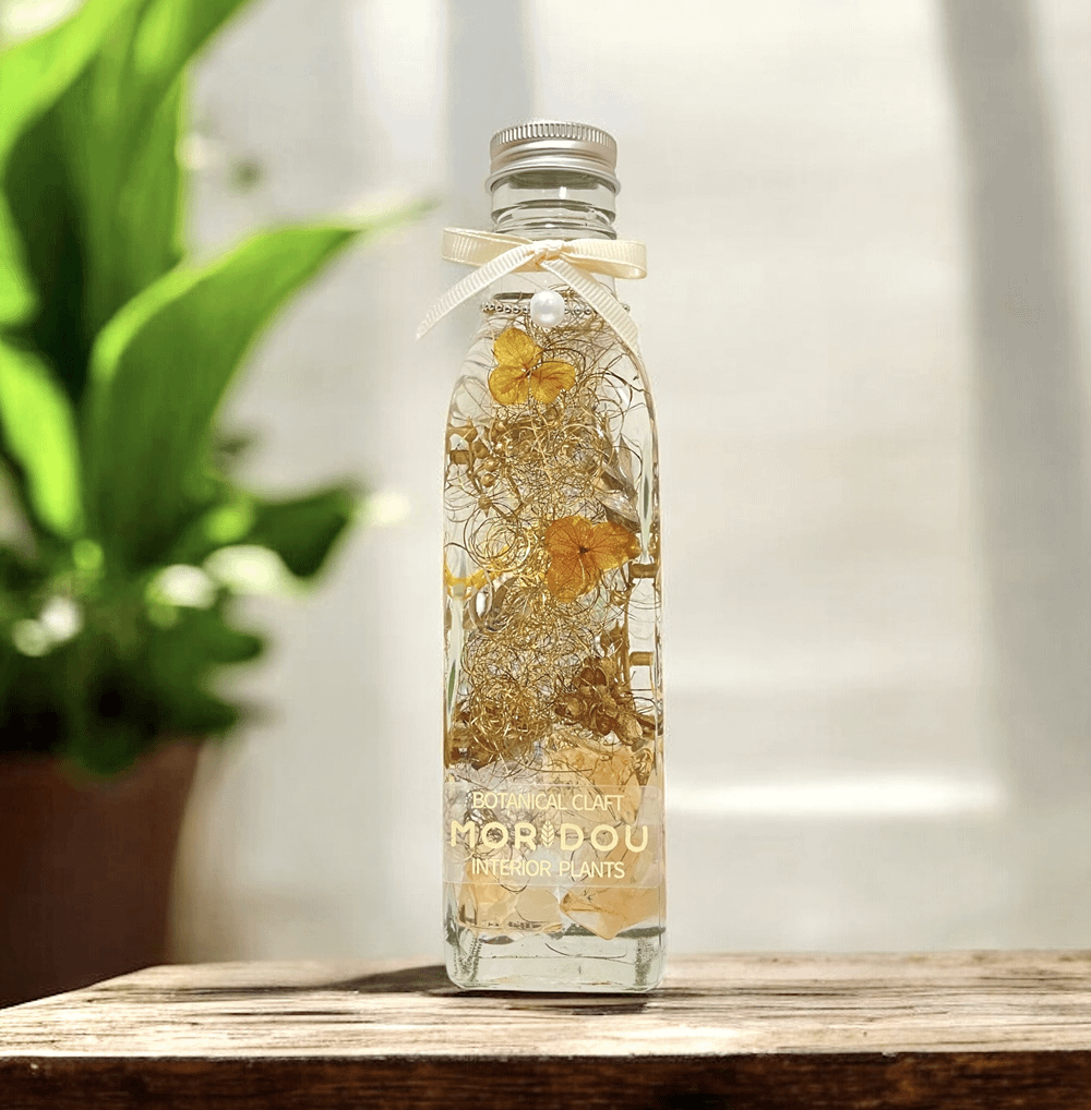 プリザーブドフラワーやドライフラワーをガラス容器に入れ、専用のオイルに浸したもの